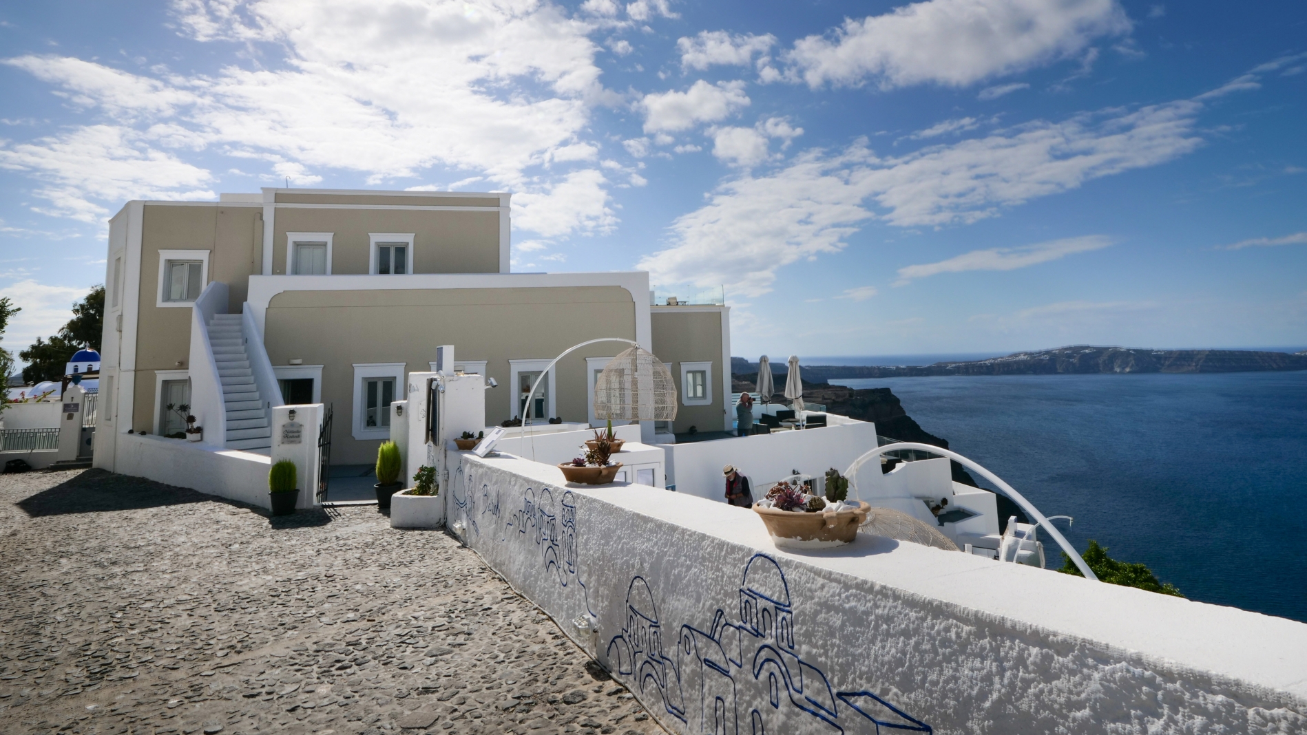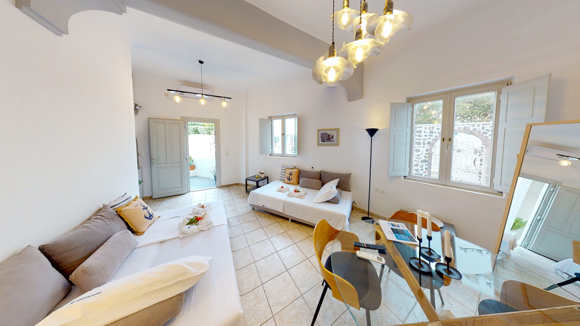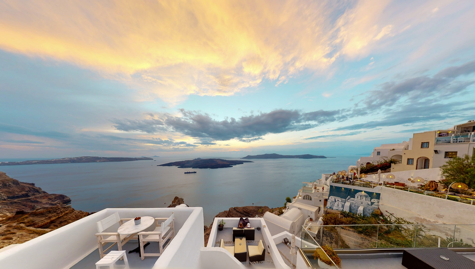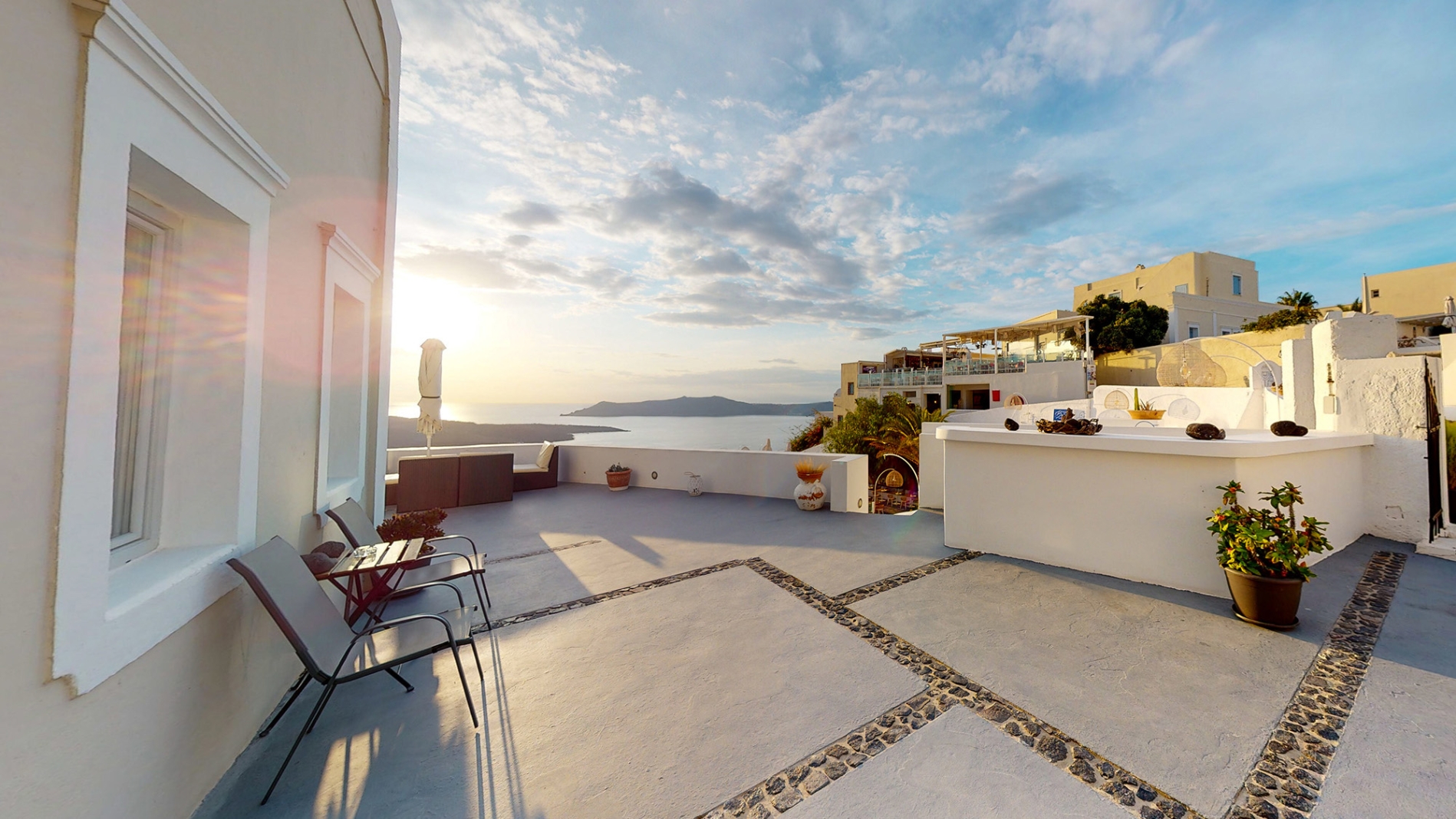 Despite being on the edge of the Caldera, the property offers step-free access, making it ideal for all ages, families, couples, or groups of friends. Its location is exceptional, just a 2-minute walk from the heart of Fira, with easy access to museums, shops, restaurants, cafés, and bus or taxi stops. For those arriving by car, the property provides easy access, with the nearest public parking only 50 meters away.