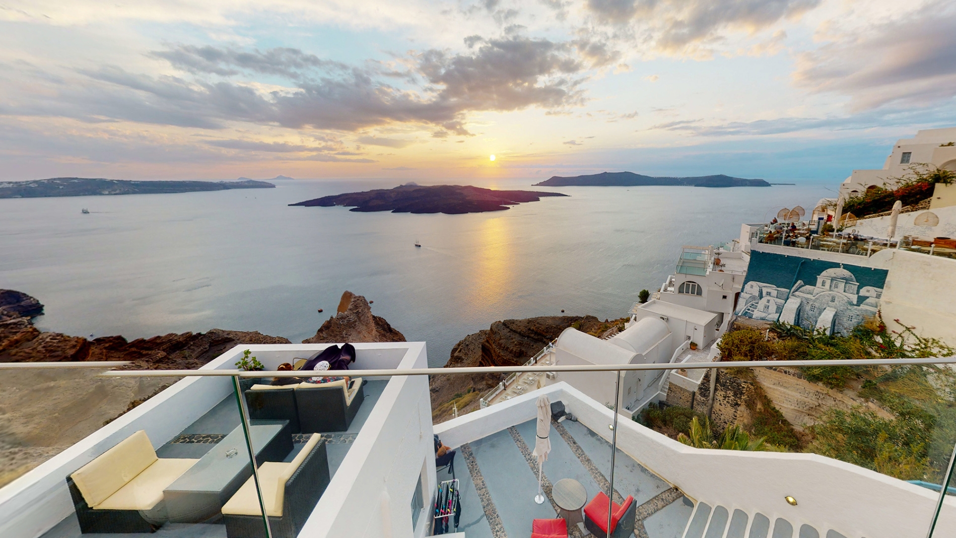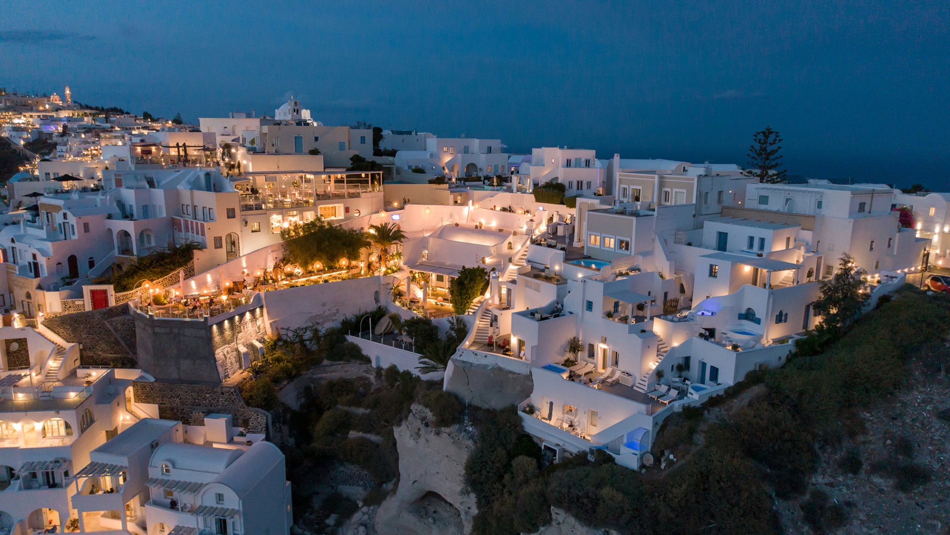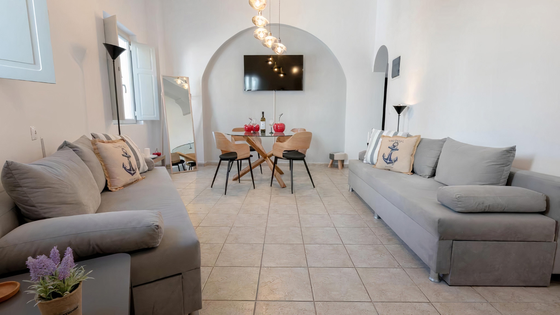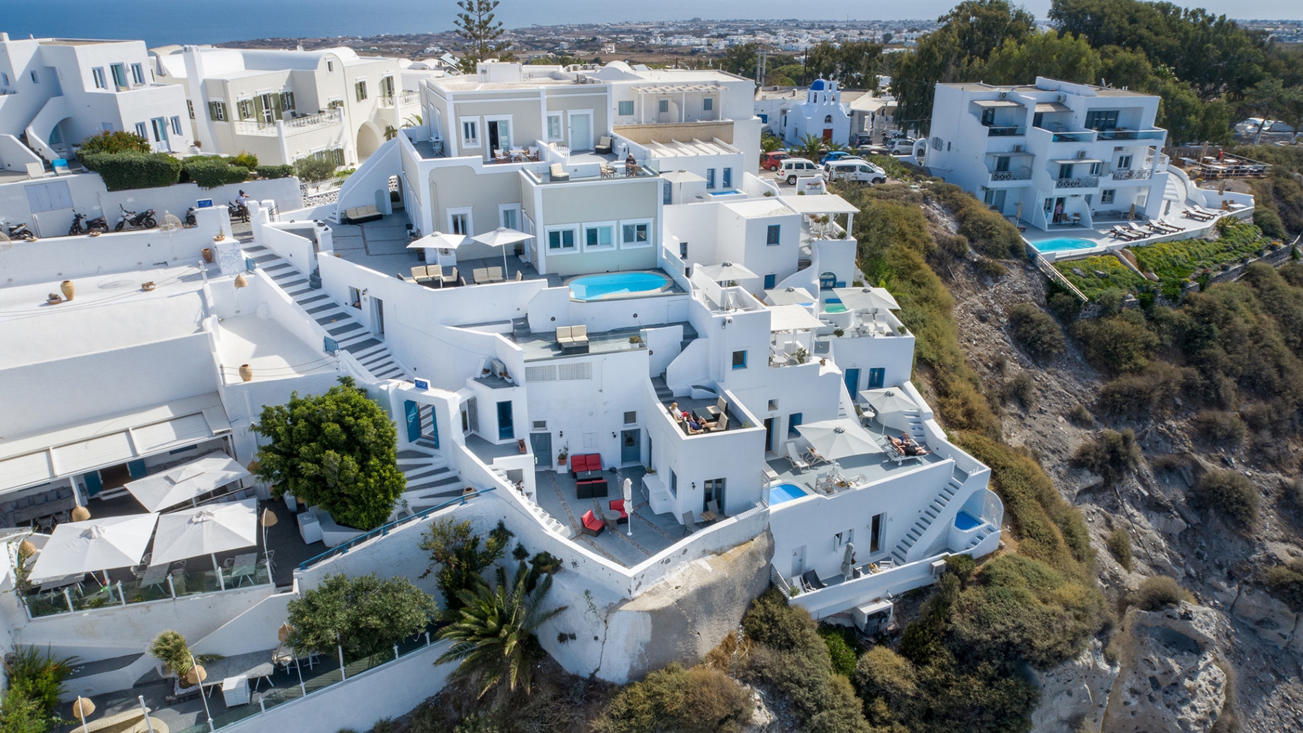 Despite being on the edge of the Caldera, the property offers step-free access, making it ideal for all ages, families, couples, or groups of friends. Its location is exceptional, just a 2-minute walk from the heart of Fira, with easy access to museums, shops, restaurants, cafés, and bus or taxi stops. For those arriving by car, the property provides easy access, with the nearest public parking only 50 meters away.