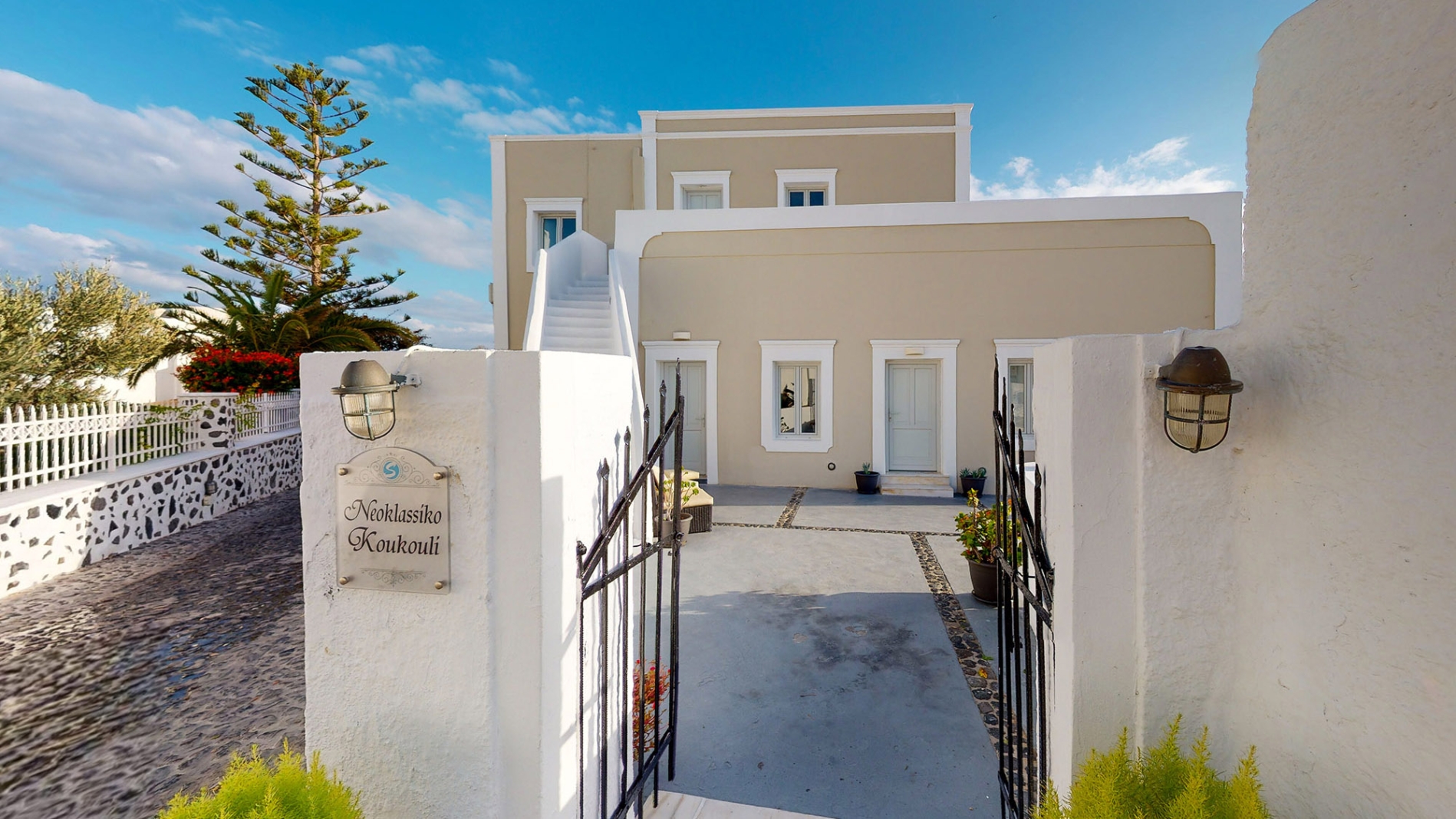 Since 1985, the house has welcomed guests, offering an authentic Santorini experience. Today, Kamares Neoklasiko continues to tell its story through its spaces: the spacious shared courtyard with breathtaking views of the Caldera and volcano, and the traditional view of one of the island’s rare “rimidia” — cobblestone pedestrian paths that preserve the authentic character of Santorini.